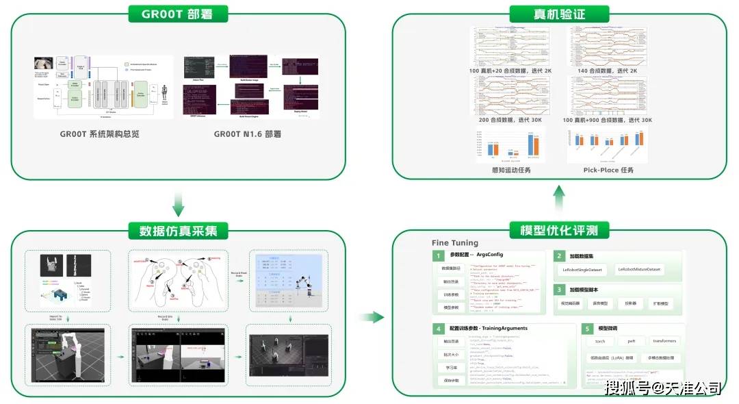 天准星辰H系列产品完成GR00T-N1.6基础大模型的应用部署、数据采集与模型优化。通过Isaac Sim搭建模拟仿真环境,构建数据采集系统,将采集的真实及仿真数据用于泛化数据集的生成;根据泛化数据集进行模型Fine Tuning,提高精细化动作的准确性和精度;经离线评估测试后开展真机实测,持续优化迭代动作成功率;最终形成从模型落地、数据供给、迭代优化到场景验证的完整链路,实现机器人在真实环境中的自主感知、决策与执行并能够持续学习不断适应新任务、提升性能。